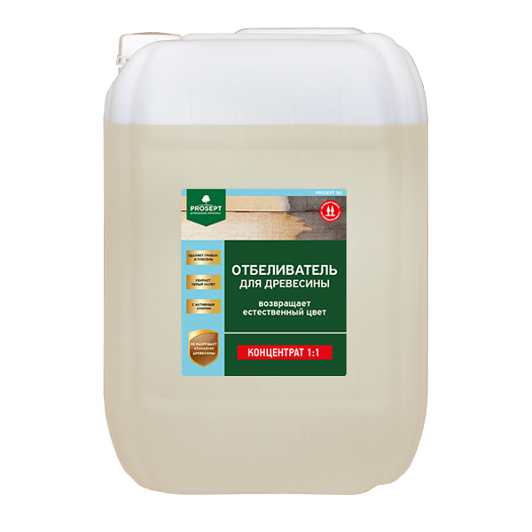 Описание Отбеливатель-Концентрат для Древесины 30л Prosept 50 для Внутренних и Наружных Работ / Просепт 50.PROSEPT 50 — концентрат, предназначенный для отбеливания древесины. Эффективно удаляет поражающие древесину деревоокрашивающие грибы, плесень, обесцвечивает серый налет.