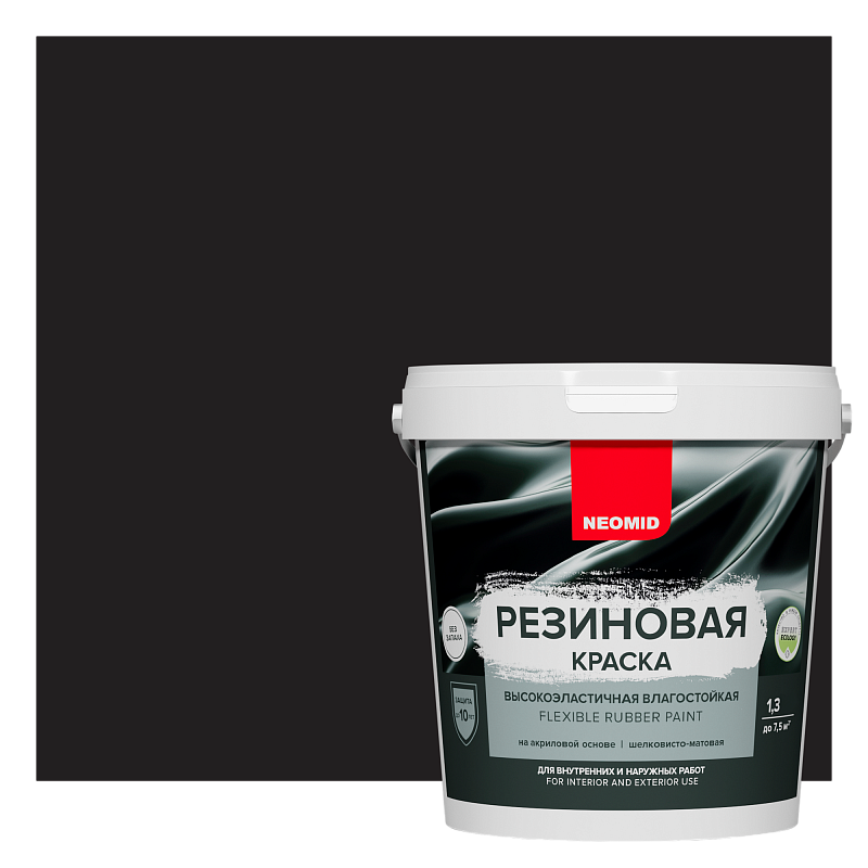 Описание Краска Резиновая Neomid 1.3кг Черный для Кровли, Цоколя, Фасада Суперэластичная, Универсальная / Неомид Резиновая.