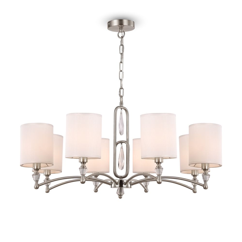 Материал арматуры – нержавеющая сталь, цвет – хром. Материал абажуров – текстиль на ПВХ, цвет – белый. Декор – прозрачное стекло. Акцентные стеклянные кристаллы на рожках со сложной огранкой.
