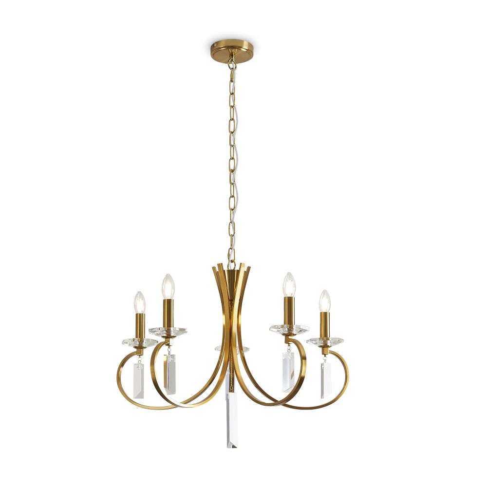 Материал арматуры — металл, цвет — никель или латунь. Подвесные светильники с цоколем E14. Доступны с пятью или шестью источниками света. Грани хрустальных подвесов создают эффект перелива радуги. Центральный декор из стеклянных трубок. Подходит для классических интерьеров.