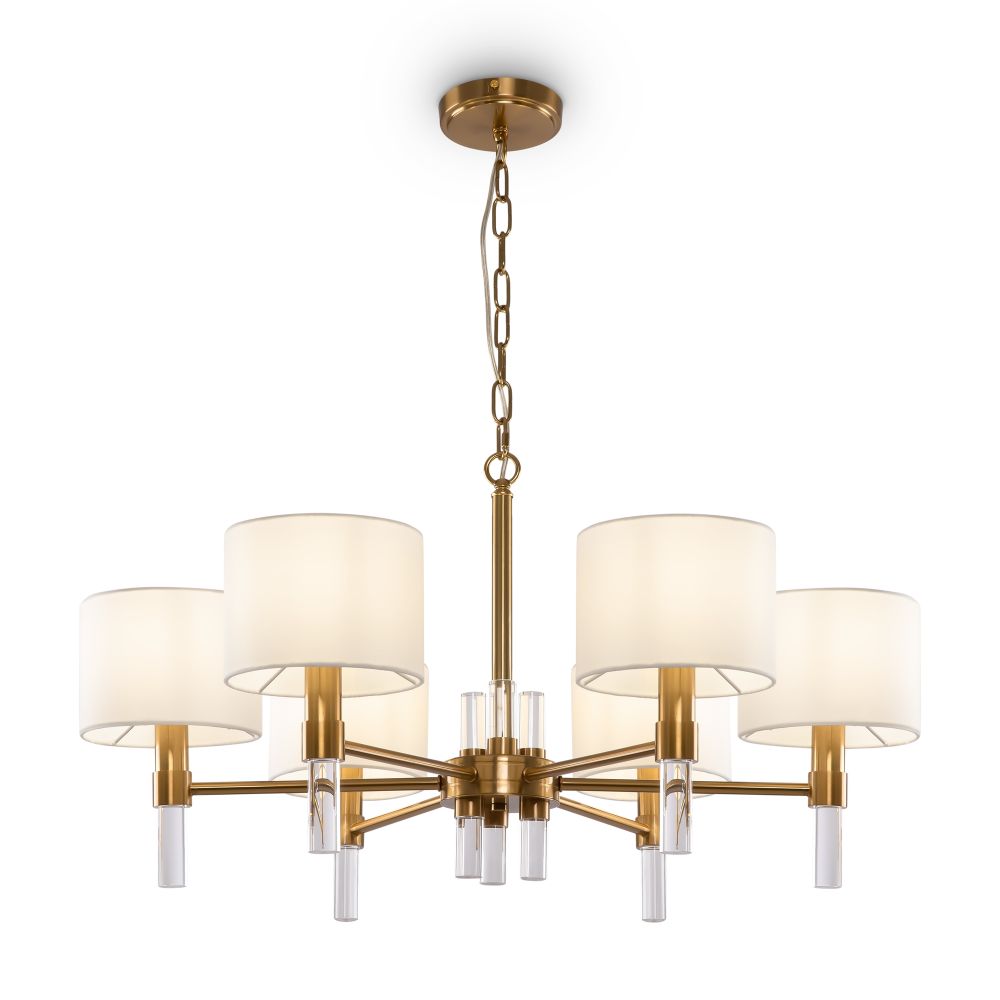 Металлическая арматура. Цвет – латунь. Тканевые абажуры белого оттенка. Декор – прозрачные акриловые трубки. Трендовая комбинация фактур и материалов. Широкий ассортимент. Торшер и подвес с цоколем Е27, лампа, бра и люстры – Е14.