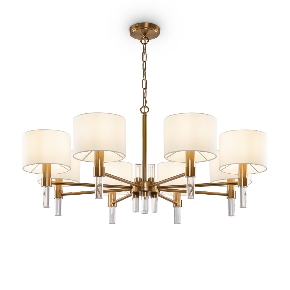 Металлическая арматура. Цвет – латунь. Тканевые абажуры белого оттенка. Декор – прозрачные акриловые трубки. Трендовая комбинация фактур и материалов. Широкий ассортимент. Торшер и подвес с цоколем Е27, лампа, бра и люстры – Е14.