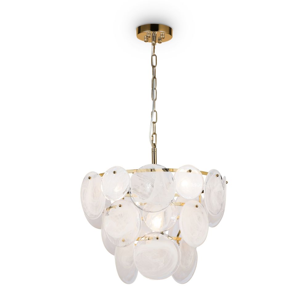 Металлическая арматура. Оттенки – латунь, хром. Оригинальный разноразмерный декор с эффектом замороженной фактуры. Материал декора – стекло. В качестве источников света используются лампы с цоколем Е14.