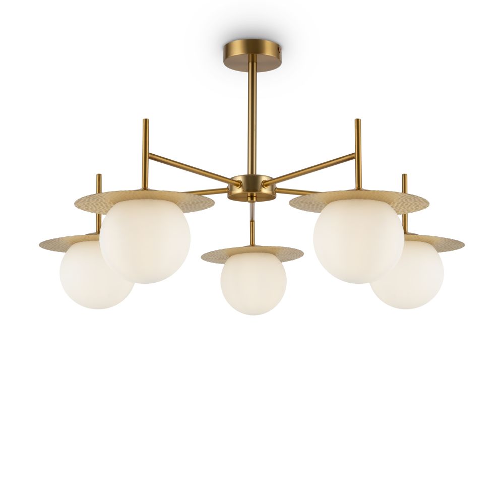 Арматура из металла, цвет – латунь. Плафоны сферической формы из матового белого стекла. Плоские розетки с эффектом чеканки. Трендовый микс фактур. Источник света – лампа с цоколем Е27.