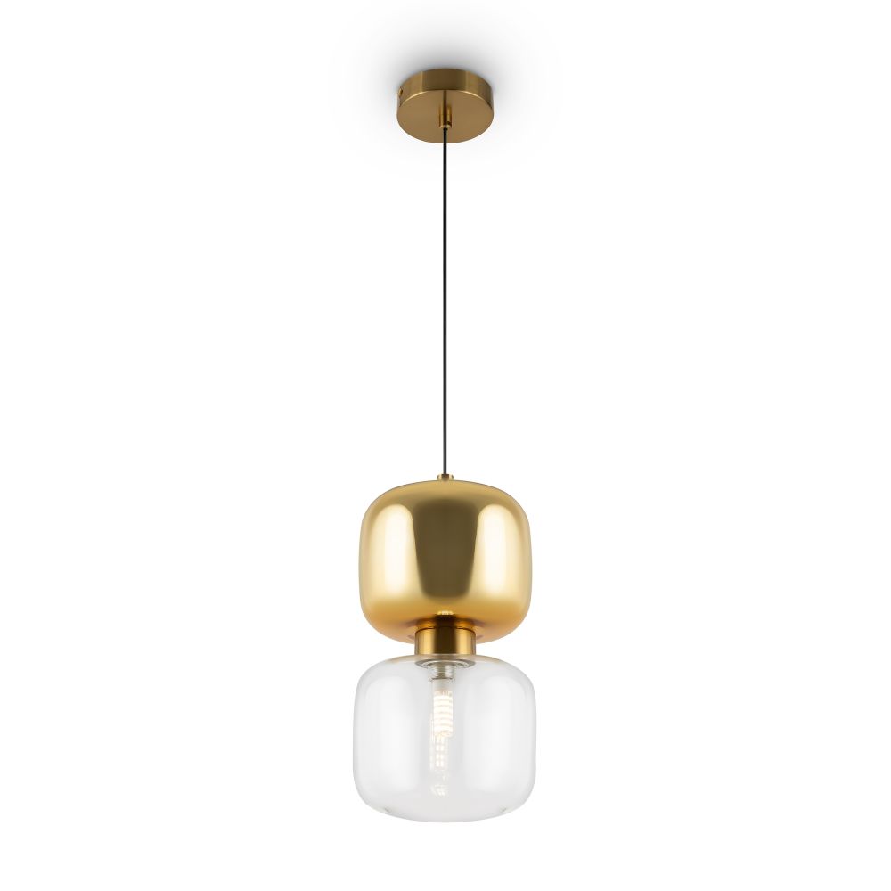 Металлическая арматура в двух оттенках: латунь, хром. Стеклянный плафон оригинальной формы. Верхняя часть плафона гальванизирована в тон арматуре, нижняя – прозрачная. Источник света – лампа G9.