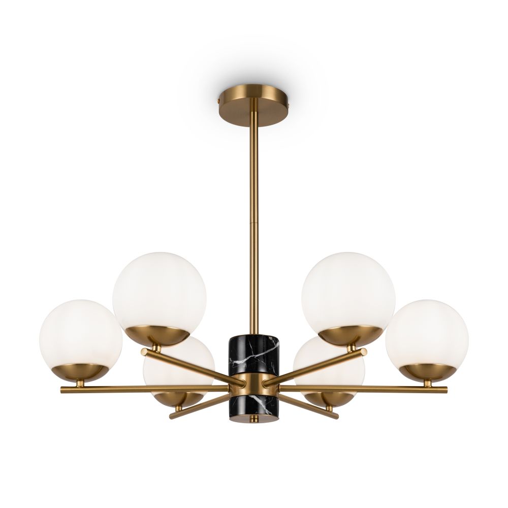 Арматура - металл, цвет - латунь. Мраморные черные элементы в основании. Плафоны-сферы из белого матового стекла с металлической апликацией у основания крепления в цвет арматуры. Сменямый источник света - лампы с цоколем Е27.