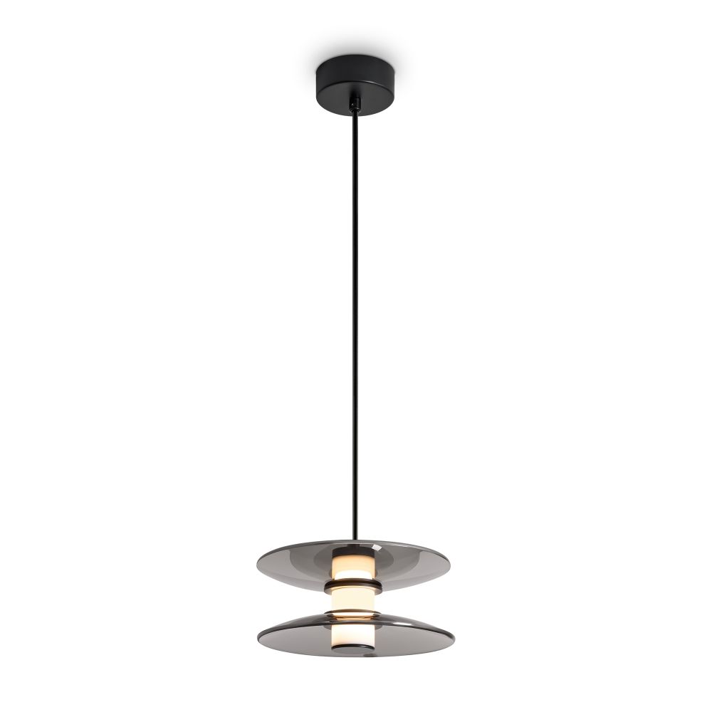 Материал арматуры — металл, цвет — черный. Плафоны выполнены из стекла дымчатого цвета. Светильники представлены в подвесном и напольном исполнении и оснащены LED-источником света с цветовой температурой 3000К. Сочетание металла и затемненного стекла создает выразительную атмосферу в современных интерьерах таких как минимализм и лофт.