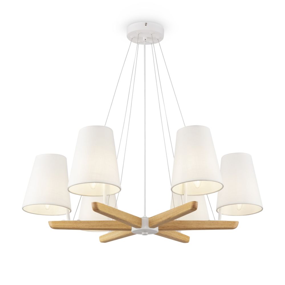 Материал арматуры – металл, цвет – белый. Абажуры из текстиля белого оттенка. Декоративные элементы из натурального дерева. Трендовый экодизайн. Источник света – лампа с цоколем E14.
