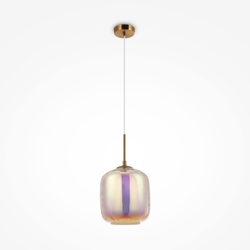 Металлическая арматура, цвет – латунь. Двойной плафон из выдувного стекла. Внутренняя часть в матовом белом оттенке. Внешняя в 4 расцветках: прозрачный, янтарный, дымчатый и с эффектом хамелеона. Цоколь Е27.