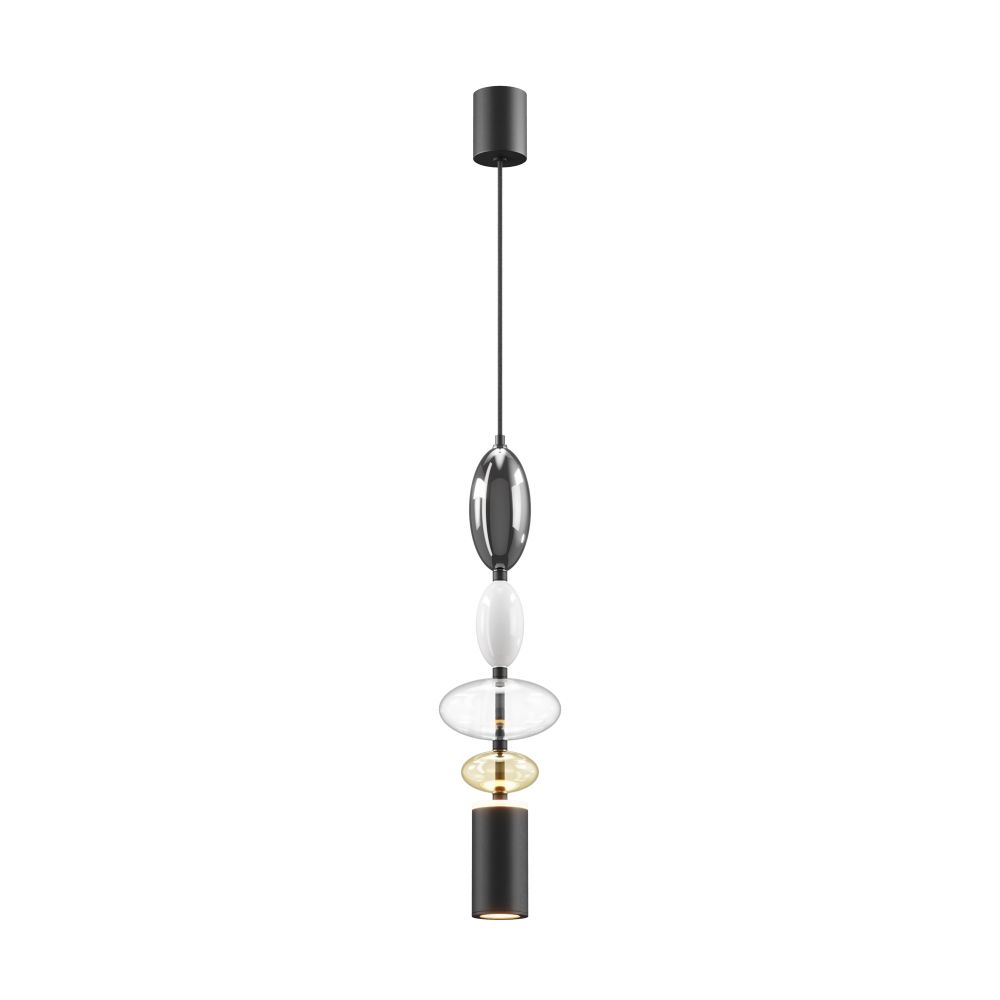 Черная металлическая арматура. Плафоны из стекла коньячного, белого, дымчатого цвета и прозрачный. Источник света комбинированный: нижний - съемная лампа с цоколем GU10, верхний - встроенный LED. Цветовая температура светильников 2700К, угол рассеивания света 120 градусов. Высота регулируется с помощью провода длиной 3 м. Монохромный дизайн, стеклянные элементы впишутся в различные стили интерьеров.