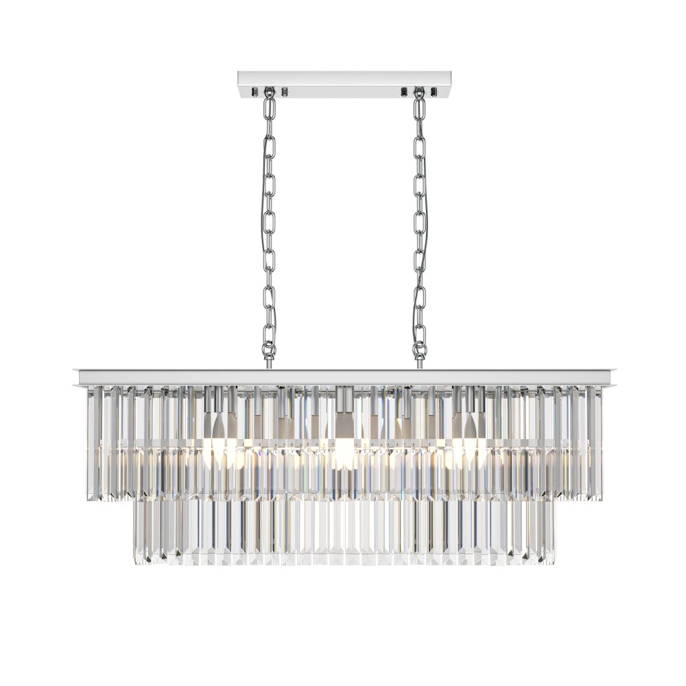 Арматура из металла в трех оттенках: латунь, хром, золото. Многоярусный декор. Подвески: прозрачное (арматура – хром, латунь) и янтарное (арматура – золото) стекло. Высота подвесных моделей регулируется.
