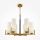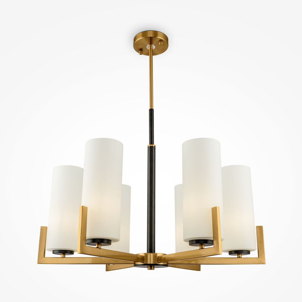 Арматура из металла, оттенок — латунь. Стеклянные плафоны в белом цвете. Часть элементов окрашена в контрастный черный оттенок. Геометрия в дизайне: цилиндрические плафоны, прямоугольные рожки.