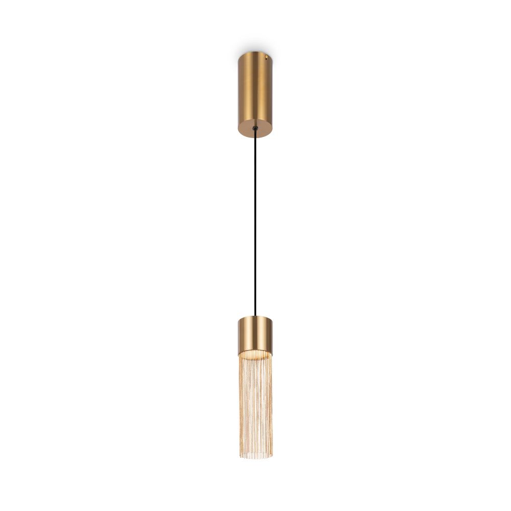 Металлическая арматура, цвет - золото. Мотивы ювелирного искусства в дизайне. Изящные цепочки на корпусе светильника создают переливы бликов. LED источник света. Цветовая температура - 3000К. Регулируемая высота подвесного светильника.