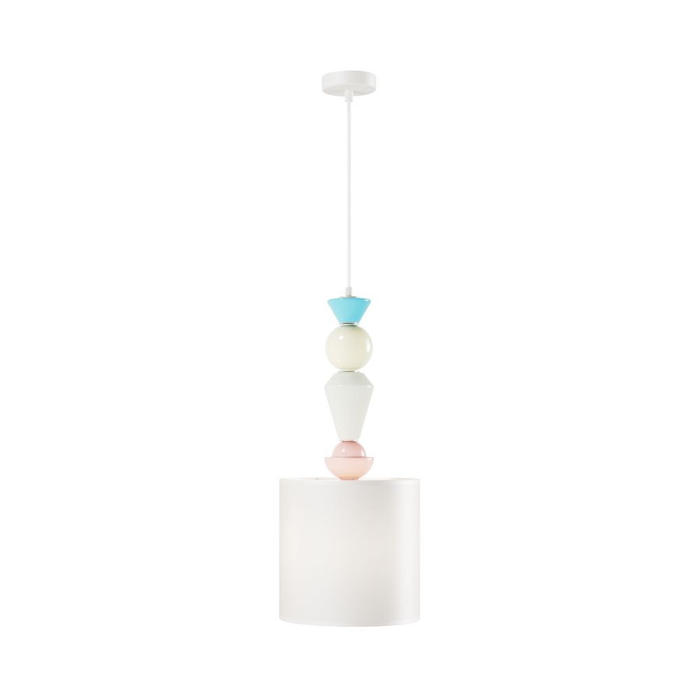 Арматура из металла, цвет - белый. Абажур выполнен из натуральной ткани, цветные декоративные элементы в пастельных тонах — из керамики. Белый абажур имеет классическую цилиндрическую форму, ткань дает мягкий рассеянный свет. Светильники комплектуются сменными лампами с цоколем Е27 (не входят в комплект). Провод подвесного светильника можно регулировать по длине. Декор напоминает стилистику крафтового искусства