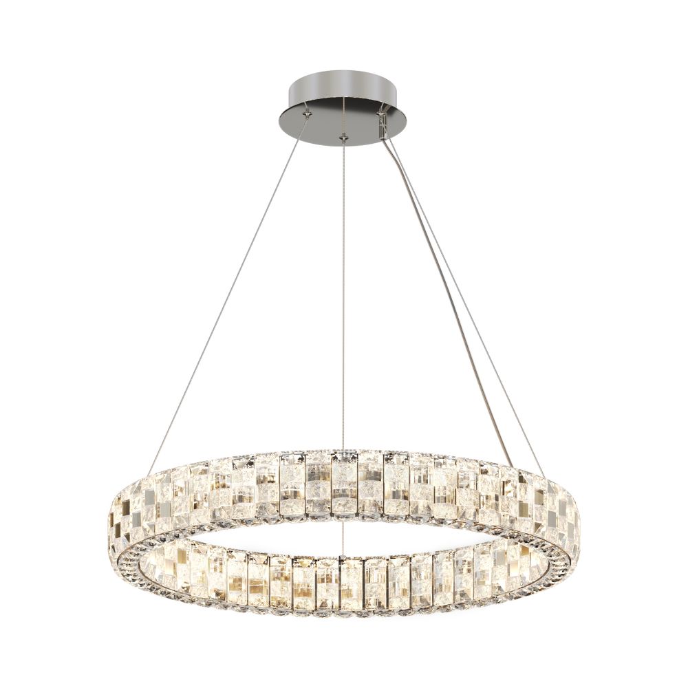 Металлическая арматура в двух вариантах цвета — хром или золото. Прозрачные декоративные элементы из хрустального стекла. Широкое кольцо снабжено LED-источником света. Цветовая температура потока излучения — 3000 К, угол рассеивания — 120 градусов. Регулируемый по высоте провод длиной 3 метра. Украшение шахматным рисунком.