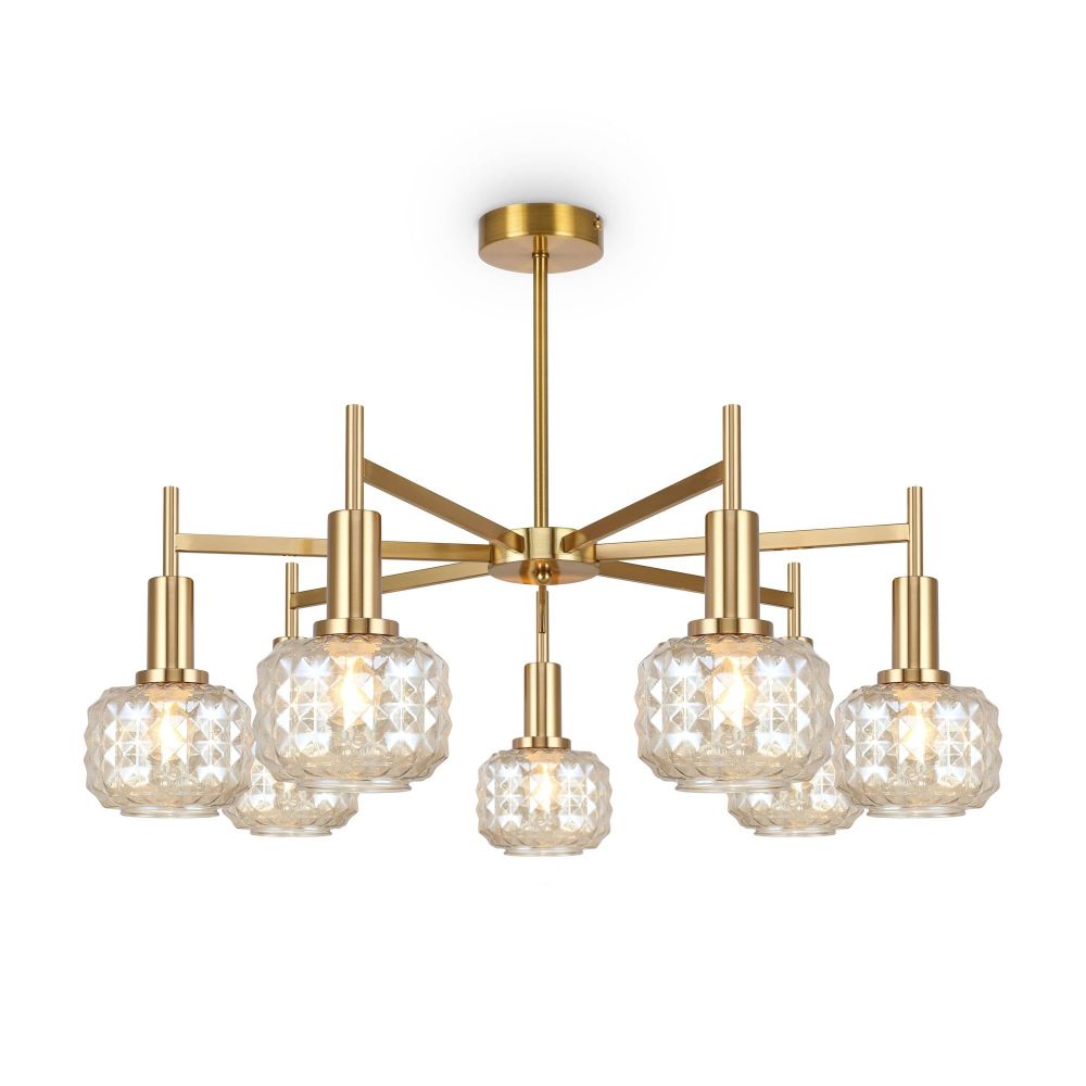 Металлическая арматура в цвете латунь. Плафоны из толстого рельефного стекла в оттенке амбра с «шипованной» огранкой. Подвесные модели регулируется по высоте. Источник света - лампа с цоколем Е14