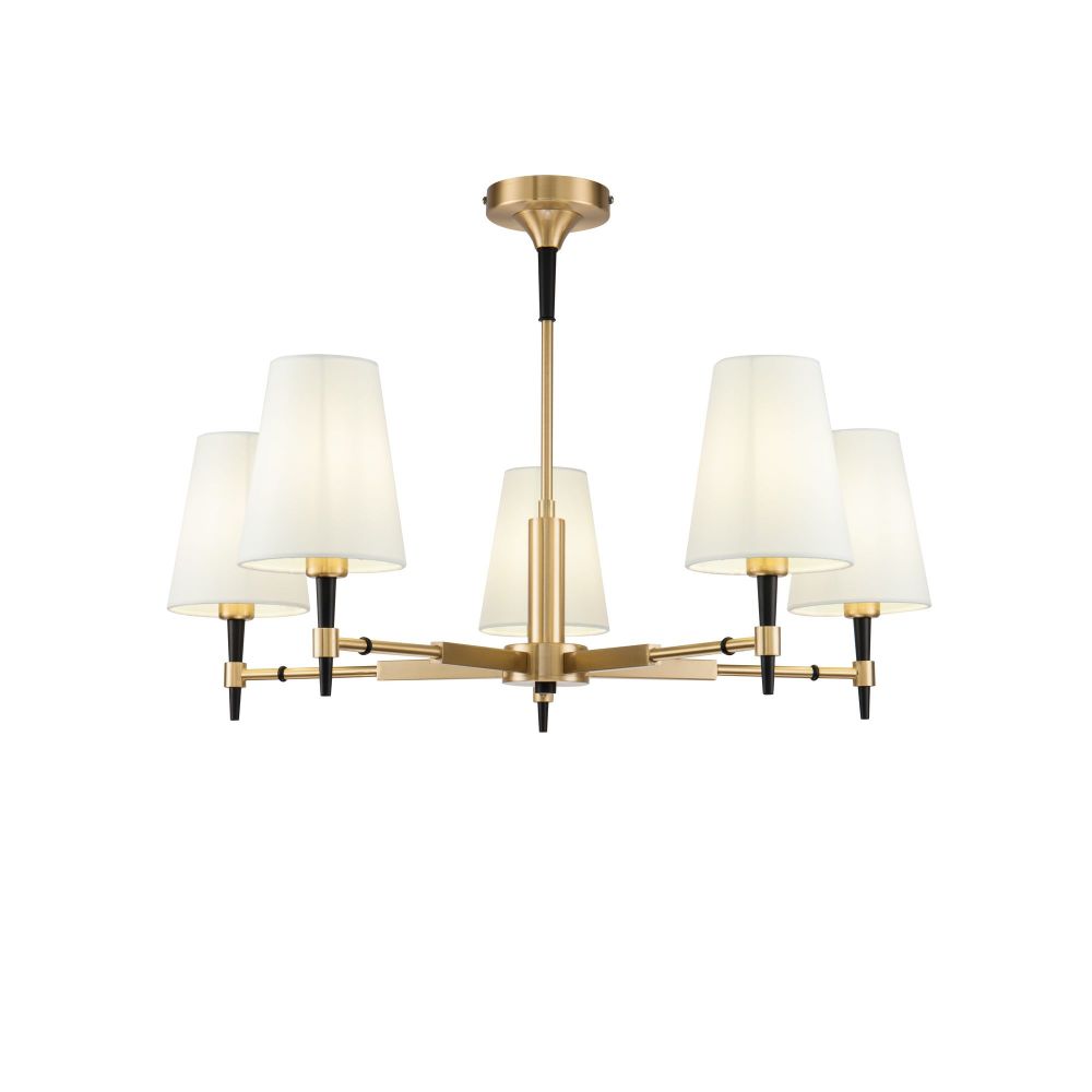 Металлическая арматура, гальванизация в цвет латуни. Часть элементов окрашена в черный цвет. Абажуры из белого текстиля, нанесенного на ПВХ. Источник света - лампа с цоколем Е14.