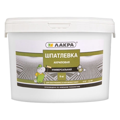 Описание Шпатлевка Акриловая Лакра 9кг Универсальная, Белая для Внутренних и Наружных Работ.