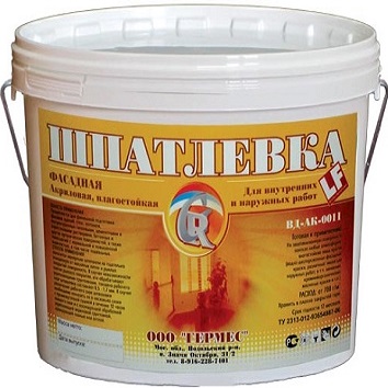 Описание Шпатлевка Фасадная Germes 15кг Акриловая, Влагостойкая для Финишной Отделки / Гермес.ОБЛАСТЬ ПРИМЕНЕНИЯ: применяется для финишной подготовки фасадов зданий, стен, потолков, оштукатуренных гипсовыми, цементными и известковыми растворами, бетонных и других органических поверхностей, а также помещений с нормальной и повышенной влажностью, в том числе подвальных.
