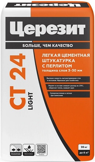 Описание Штукатурка Цементная Легкая Ceresit CT 24 Light 20кг с Перлитом Толщина Слоя 3-30 мм / Церезит СТ 24 Лайт.Ceresit CT 24 Light. Легкая цементная штукатурка