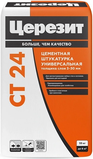 Описание Штукатурка для Ячеистого Бетона Ceresit CT 24 25кг Универсальная, Цементная, Толщина Слоя 3-30 мм / Церезит СТ 24.Ceresit CT 24. Штукатурка для ячеистого бетона