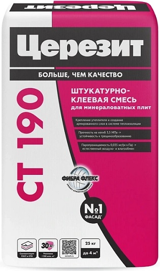 Описание Штукатурно-Клеевая Смесь Ceresit CT 190 MW Flex 25кг для Минеральных Плит / Церезит СТ 190.Смесь для крепления минераловатных плит и создания базового штукатурного слоя при наружной теплоизоляции фасадов