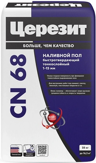 Самовыравнивающаяся смесь CN 68 предназначена для выравнивания бетонных, цементно-песчаных, ангидритных и гипсовых горизонтальных оснований под укладку керамических плиток, линолеума, ковролина, ламината и других напольных покрытий, кроме паркета, в сухих помещениях с низкими механическими нагрузками (жилых, бытовых, административных, общественных и т.п.). Может применяться на основаниях с пониженной прочностью. Предназначена как для ручного, так и для механизированного нанесения. Смесь можно наносить слоем толщиной от 1 до 15 мм.
