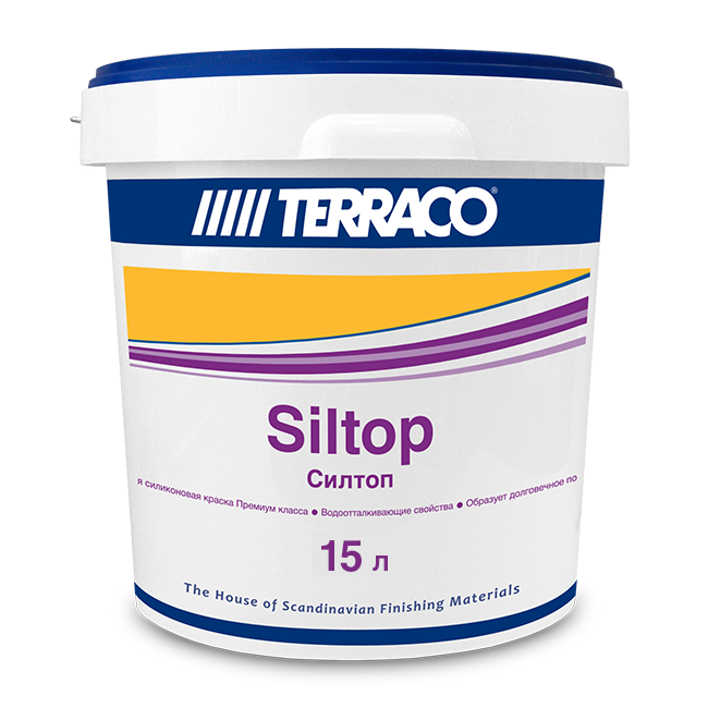 Описание Terraco Siltop Премиальная Силиконовая Краска для Фасадных Работ 15л.Силтоп – фасадная краска с высоким содержанием силиконового полимера (эмульсии) предназначенная для высококачественных отделочных работ на минеральных поверхностях любого типа. Силттоп образует равномерное матовое окрасочное покрытие, позволяя максимально проявляться всем преимуществам и техническим характеристикам силиконовых материалов, что позволяет обеспечивать более продолжительную защиту и эксплуатацию окрашенным Силтопом конструкциям.