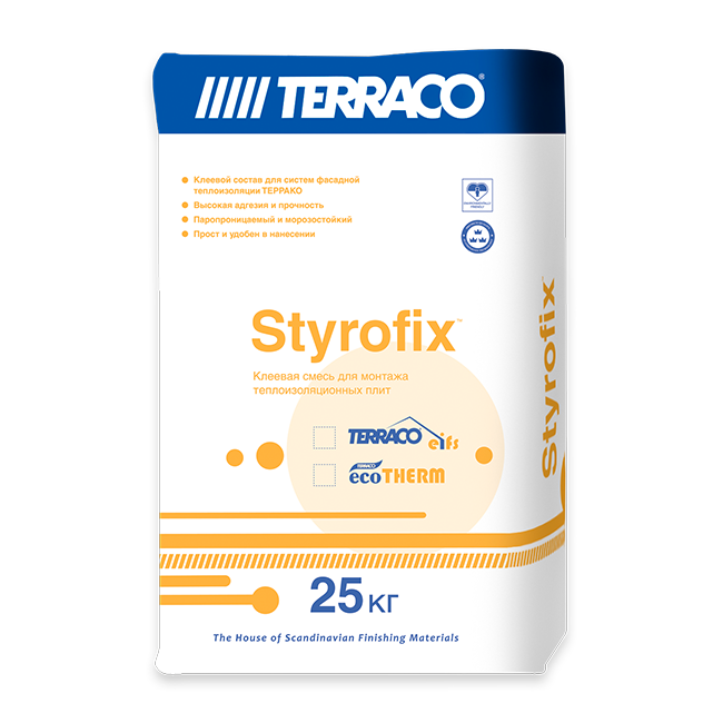 Описание Terraco Styrofix Euro Минеральный Клеевой Состав на Цементной Основе для Приклеивания Всех Видов Теплоизоляционных Панелей 25кг.Стайрофикс EURO - это минеральный клеевой состав на цементной основе для приклеивания всех видов теплоизоляционных панелей, таких как пенополистирол (EPS), экструдированный пенополистирол (XPS), минераловатные плиты, при устройстве систем фасадной теплоизоляции премиального сегмента Террако EURO, а также при устройстве иных системных решений в соответствии с технологией устройства СФТК.