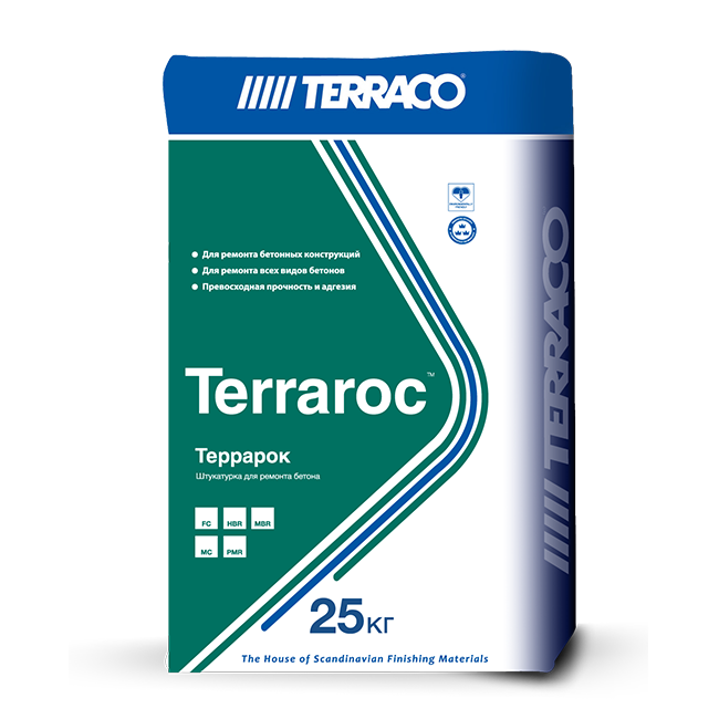 Описание Terraco Terraroc HBR Толстослойная Ремонтная Штукатурка для Бетона, Армированная Волокном 25кг.Террарок HBR – толстослойная ремонтная штукатурка специально разработанная для ремонта бетонных поверхностей, имеющих глубокие повреждения. Благодаря большому количеству полимеров в своем составе обладает отличной адгезией ко всем видам бетонных поверхностей, а наличие в составе специального армирующего волокна обеспечивает компенсацию усадочных процессов и высокую прочность на изгиб.