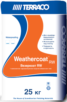 Описание Гидроизоляция Обмазочная Terraco Weathercoat RW 25кг Однокомпонентная, Цементная Белая, Серая / Террако Везеркоат RW.Везеркоат RW – это однокомпонентная минерально-полимерная бесшовная гидроизоляция обмазочного типа. Обладает отличным сцеплением с новыми и старыми поверхностями из бетона, различного вида кладок. Идеально подходит для использования на стабильных основаниях, таких как фундаменты, емкости для воды, подпорные стены, образуя прочное, жесткое долговечное, обладающее хорошими показателями эластичности, гидроизоляционное покрытие, идеально подходящее для зон с экстремальными климатическими условиями.