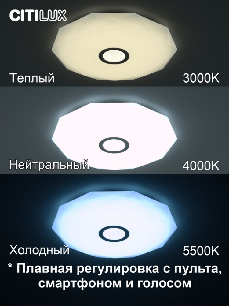 Умная люстра Citilux Диамант Смарт CL713A60G нового поколения с голосовым управлением Люстры коллекции Диамант Смарт давно закрепили за собой звание самых популярных потолочных светодиодных светильников в России. Оригинальный дизайн, максимальная компактность, широчайший функционал, доступная цена, и это далеко не полный перечень достоинств устройств серии Диамант Смарт. Однако время не стоит на месте и усилиями наших инженеров модели постоянно совершенствуются. Если когда-то вы удивлялись тому, что люстре можно отдавать команды при помощи пульта дистанционного управления, то теперь мы представляем новейшие модели, с практически неограниченными возможностями. Светильником CL713A60G коллекции Диамант Смарт вы сможете управлять не только при помощи обычного клавишного выключателя и пульта ду, но и фирменного мобильного приложения, доступного на операционных системах IOS и Android, а также просто голосом. Особенности работы с помощью голосового управления Модель работает с самыми популярными в России голосовыми помощниками Алиса и Маруся, также доступно управление с помощью Siri, путем назначения голосовых команд для индивидуальных сценариев. Благодаря этой функции вы получаете уникальную возможность контролировать освещение в квартире, загородном доме или на даче, из любой точки мира, через сеть интернет, при помощи обычного мобильного устройства. Приложение на русском языке, разработанное программистами нашей компании, поможет вам буквально в несколько шагов синхронизировать светильники с вашим мобильным устройством, при этом у вас будет возможность управлять всеми световыми приборами на вашей территории, как синхронно, так и независимо в каждом помещении. Усовершенствованный пульт дистанционного управления Потолочный светильник CL713A60G комплектуется пультом управления новейшего поколения, получившим вдвое больше функционала, за счет реагирования на длинные и короткие нажатия клавиш. Также мы добавили на пульт 4 канала, на которые возможно привязывать не ограниченное количество умных люстр нашего производства, и управлять всеми устройствами синхронно, или по отдельности, любым выбранным каналом. Функционал каждой клавиши можно изучить, просто считав QR-код на задней крышке самого пульта камерой Вашего смартфона. Удобное управление обычным настенным выключателем Традиционно наш светильник снабжен удобнейшим управлением с помощью обычного настенного выключателя, никакой специализированный приобретать и устанавливать не требуется. С выключателя будут срабатывать режимы, которые предварительно запрограммированы на кнопки памяти от М1 до М4 пульта управления. При первом включении, если Вы долго отсутствовали дома, всегда включится режим с кнопки М1, если светильник выключить с выключателя и в течении 5 секунд включить обратно, сработает режим с клавиши М2. Последующие аналогичные циклы переберут оставшиеся кнопки памяти. Citilux Smart – прорыв в области умного освещения ХАРАКТЕРИСТИКИВес и габариты упаковки Длина (мм) 550 Высота (мм) 80 Ширина (мм) 550 Вес (грамм) 1963 Прочие Тип cветильника Люстра потолочная Коллекция Диамант Смарт Мощность общая, Вт 65 Размещение Потолочное/Настенное Освещаемая площадь - кв.м 21 Высота, мм 75 Диаметр, мм 500 Тип крепления Через основание Стиль Современный Для любого потолка, в т.ч.натяжного Да Форма с