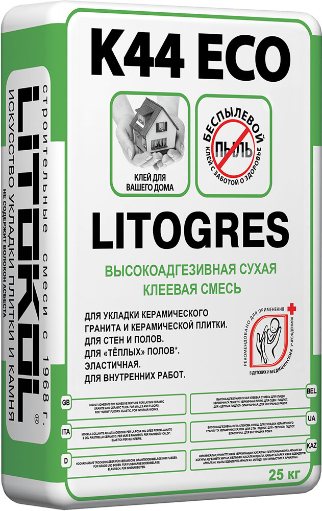 Описание Усиленная Беспылевая Клеевая Смесь Litogres K44 Eco 25кг Litokol.LITOGRES K44 ECO — сухая клеевая смесь на основе цемента, содержит специальные синтетические смолы и химические добавки, придающие продукту после разведения водой эластичность и высокую адгезию на традиционных строительных основаниях.