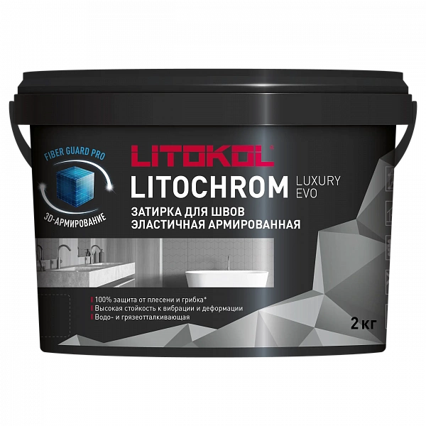 LITOCHROM LUXURY Evo — затирочная смесь на основе цемента, минеральных наполнителей, высококачественных полимерных и органических добавок и цветных пигментов. Предназначена для затирки межплиточных швов, шириной от 1 до 10 мм включительно, при облицовке стен и полов керамической плиткой, стеклянной мозаикой, керамогранитом, натуральным камнем, агломератом. Широкая цветовая гамма LITOCHROM LUXURY Evo придаёт законченный вид облицованной поверхности. позволяя создать контраст или гармонию с цветом облицовочного материала.