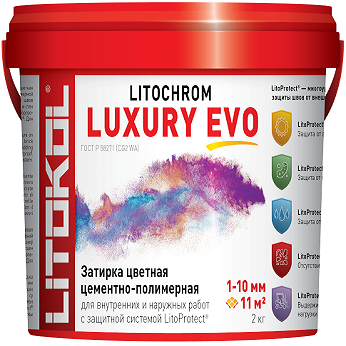 LITOCHROM LUXURY Evo — затирочная смесь на основе цемента, минеральных наполнителей, высококачественных полимерных и органических добавок и цветных пигментов. Предназначена для затирки межплиточных швов, шириной от 1 до 10 мм включительно, при облицовке стен и полов керамической плиткой, стеклянной мозаикой, керамогранитом, натуральным камнем, агломератом. Широкая цветовая гамма LITOCHROM LUXURY Evo придаёт законченный вид облицованной поверхности. позволяя создать контраст или гармонию с цветом облицовочного материала.