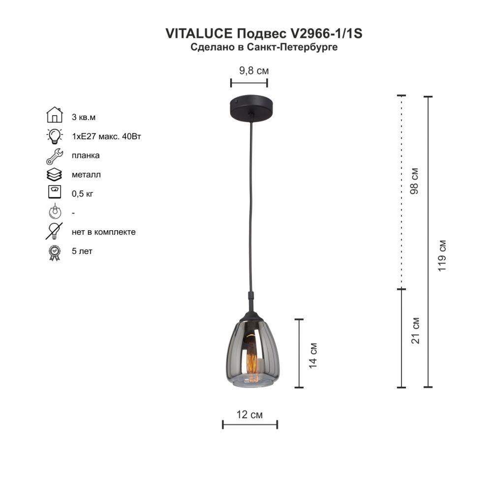 Описание Подвес Vitaluce V2966-1/1S, 1xE27 Макс. 40Вт Черный, Матовый / Виталюче.