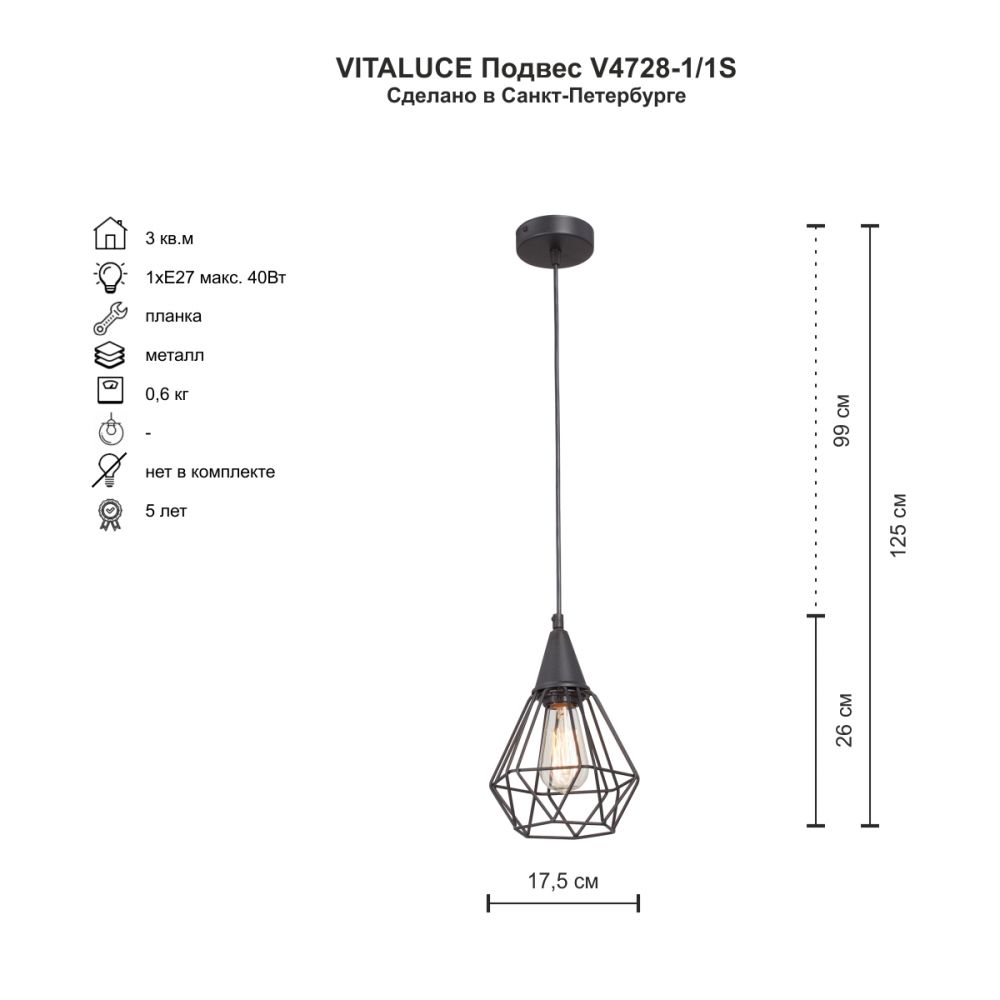 Описание Подвес Vitaluce V4728-1/1S, 1xE27 Макс. 40Вт Черный, Матовый / Виталюче.