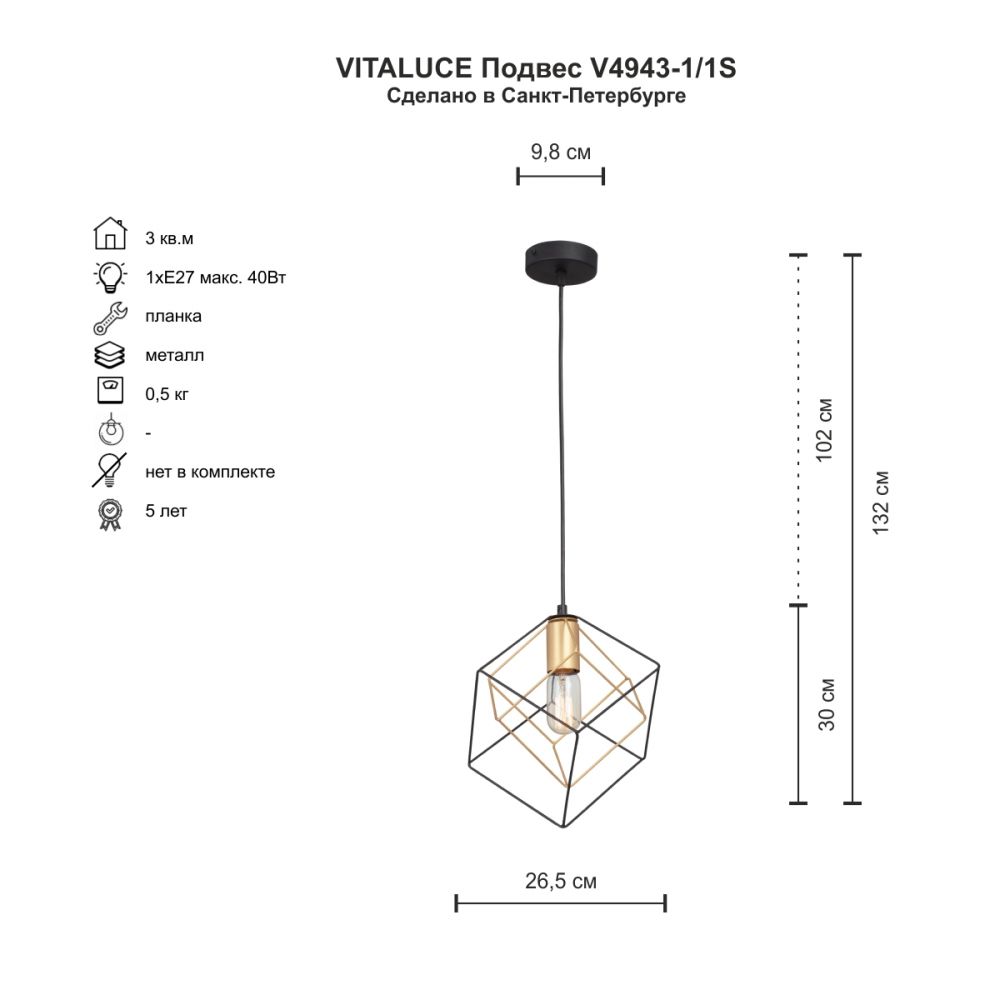 Описание Подвес Vitaluce V4943-1/1S, 1xE27 Макс. 40Вт Черный, Матовый, с Золотом / Виталюче.